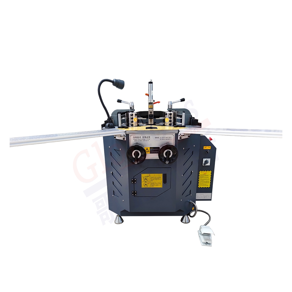 該組角機(jī)是高檔鋁門窗生產(chǎn)專用設(shè)備,適用于角碼結(jié)構(gòu)型鋁門窗90度角聯(lián)接。安裝三套型材加工刀具,減少換刀時(shí)間,增加工作效率,常用刀具可長(zhǎng)期固定使用。